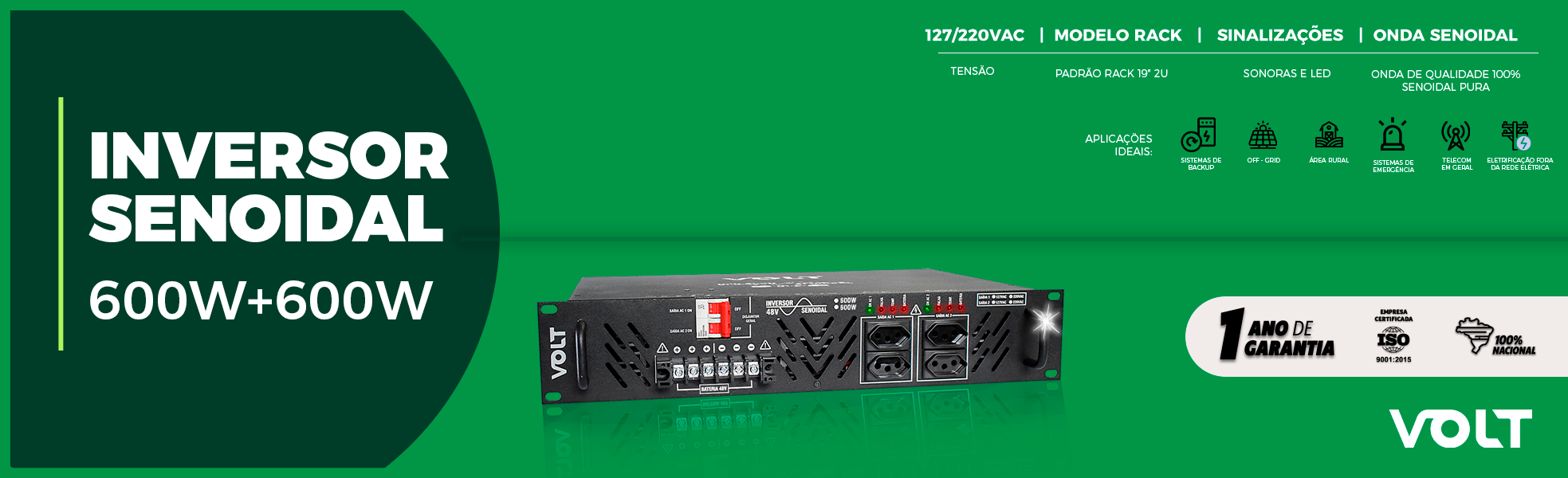 Desenvolvidos e fabricados no Brasil, os Inversores Senoidais Volt Tecnologia contam com 01 ano de garantia.