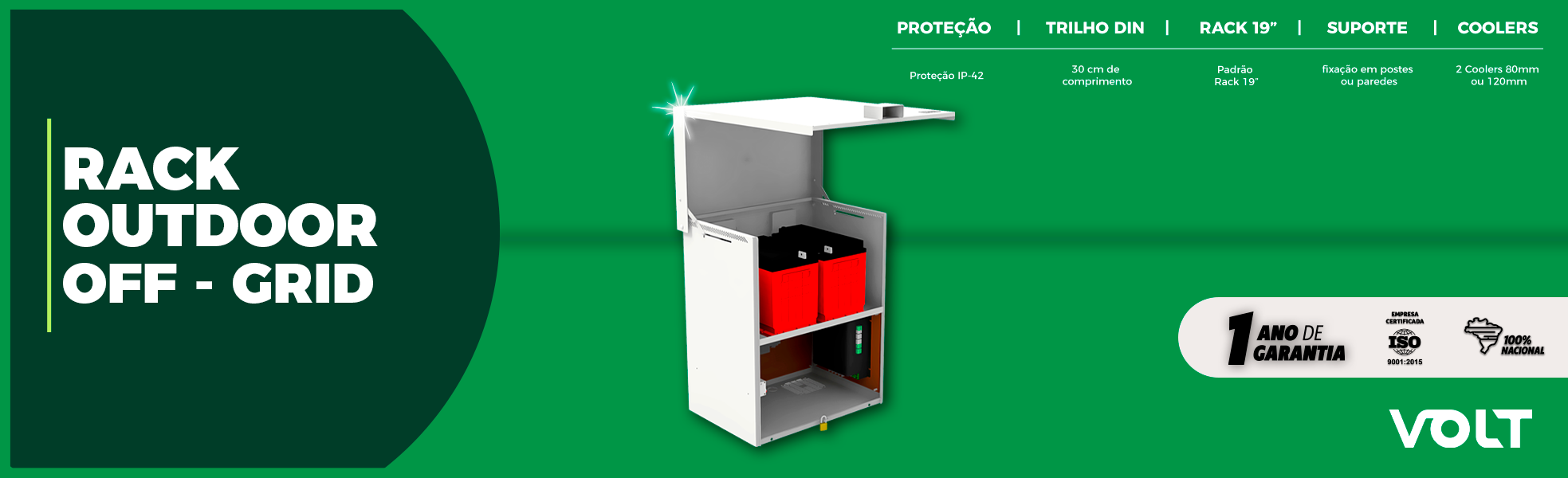 Fabricado com materiais de altíssima qualidade. O Rack Outdoor OFF-GRID tem como característica principal a proteção e acondicionamento de equipamentos em ambientes externos. Indicado para abrigar equipamentos e podem ser instalados em diversos segmentos como: telecom., automação , segurança eletrônica , solar fotovoltaico, IoT e agro. Suporta até 2 baterias de 105Ah.